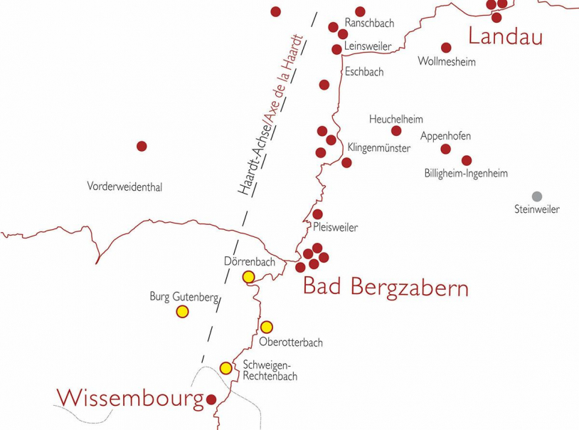 [Hinweis zur „Haardt-Achse“: Vieles spricht dafür, dass eine Alternative der mittelalterlichen Wegeachsen der Jakobspilger aus Richtung Worms auch wohl entlang des Randes der Haardt über Bad Dürkheim – Neustadt – Edenkoben – Landau – Klingenmünster – Bad Bergzabern, Wissembourg (Elsass) in Richtung Strasbourg (Elsass) verlief. Eine relativ große Anzahl von Zeugnissen der mittelalterlichen Baukultur, darunter auch bedeutende Klöster, markiert hier bis in die Gegenwart eine imaginäre Verbindungsachse, die jedoch bislang noch nicht offiziell ausgewiesen und markiert ist. Innerhalb des Projektraumes „Sternenweg/Chemin des étoiles“ wurden daher auch – entlang des „Haardt-Gebirges“ – zwischen der offiziellen Pfalz | Südroute und Pfalz | Nordroute mittelalterliche Kulturdenkmäler erfasst.]